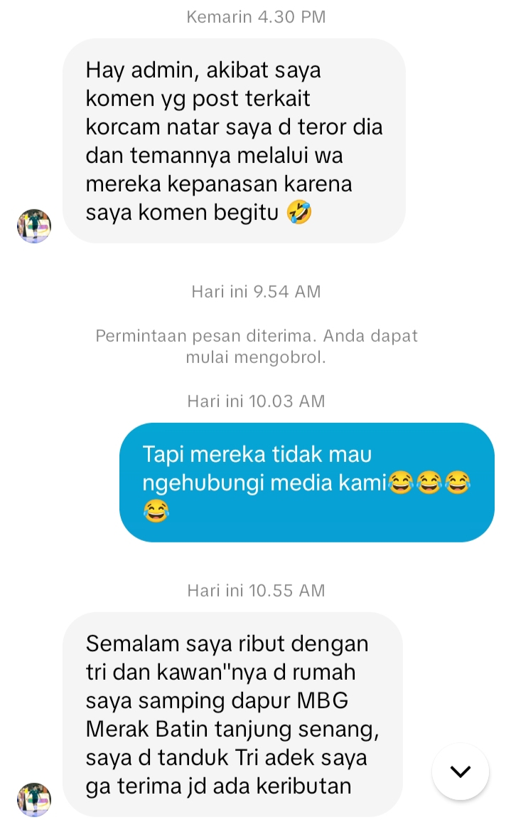 Peristiwa tersebut disebut terjadi pada Selasa (3/3/2026). Warga yang mengaku berasal dari Merak Batin mengirimkan pesan langsung (DM) kepada admin TikTok Lensanewstv dan mengaku mendapat tekanan setelah memberikan komentar pada unggahan terkait Korcam SPPG Natar.